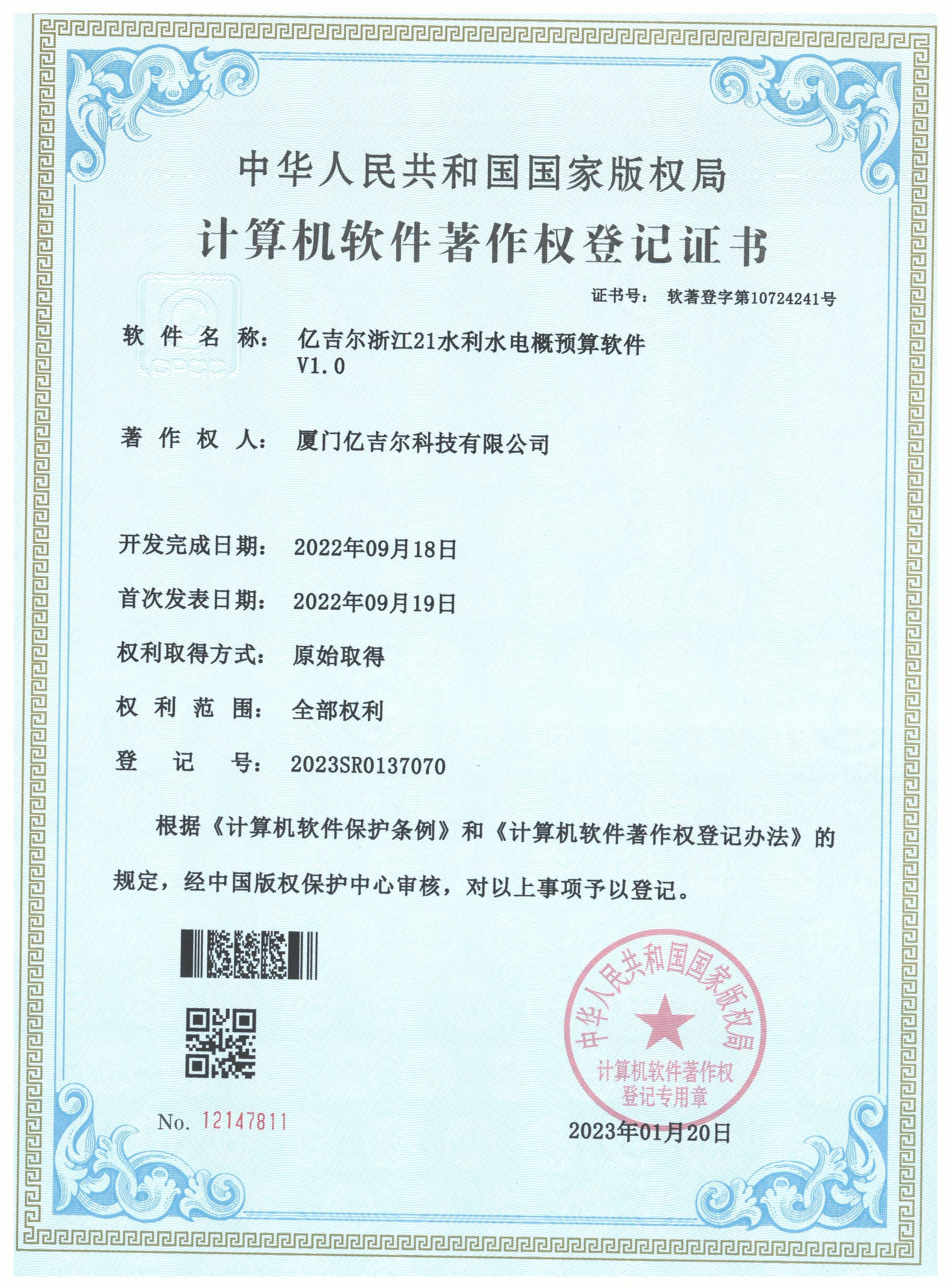 億吉爾浙江21水利水電概算軟件登記證書 發(fā)布日期:2023年11月22日 瀏覽次數(shù):3019 關(guān)鍵字: 公司 1/1億吉爾浙江21水利水電概算軟件登記證書(2022R11L1869444)